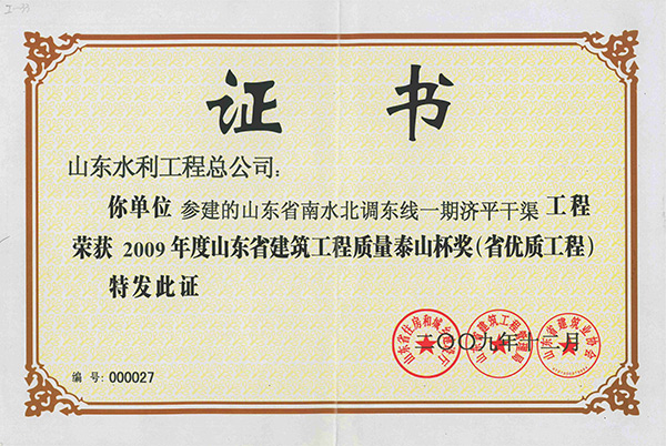 8xbet体育"山东省南水北调东线一期济平干渠工程"荣获2009年度山东省建筑工程质量泰山杯