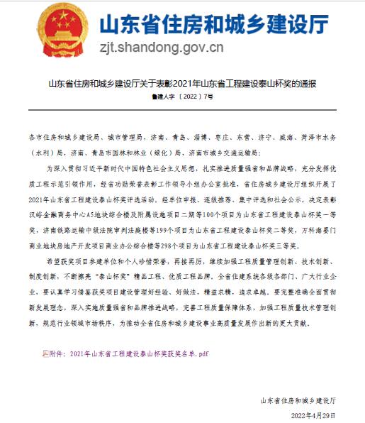 8xbet体育两项工程荣获2021年度“山东省工程建设泰山杯奖”