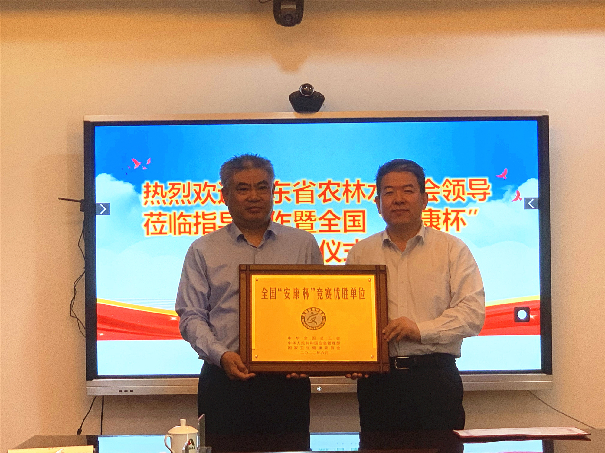 5月12日,8xbet体育举行了全国、山东省“安康杯”竞赛优胜单位授牌仪式。省农林水工会主席张志刚、主任科员吴开明,8xbet体育党委书记、董事长刘深远,党委副书记、董事、总经理靳文硕,党委委员、副总经理付海华,党委组织部、安全管理部相关人员参加仪式活动。