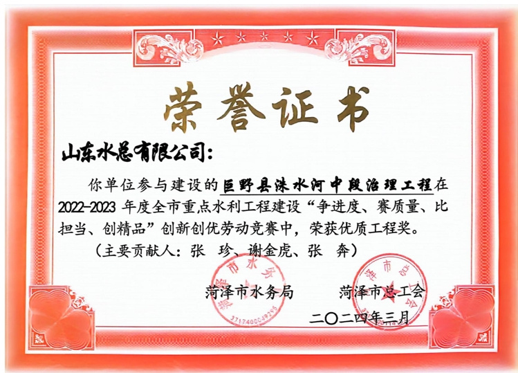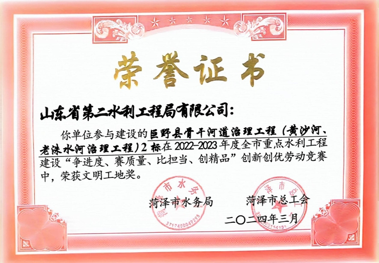 近日,菏泽市水务局、菏泽市总工会公布了“2022-2023年度全市重点水利工程建设“争进度、赛质量、比担当、创精品”创新创优劳动竞赛”获奖名单,8xbet体育及权属单位二局有限8xbet体育共荣获优质工程1项、文明工地2项、QC成果1项,优秀项目经理1项。