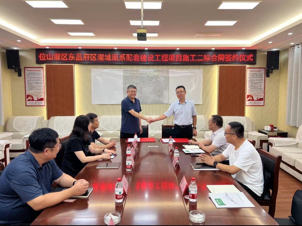 7月15日,二局有限8xbet体育新中标的位山灌区东昌府区灌域渠系配套建设工程项目签约仪式在该项目驻地举行,东昌府区水利局代表,发包人代表,承建方二局有限8xbet体育代表等参加签约仪式。
