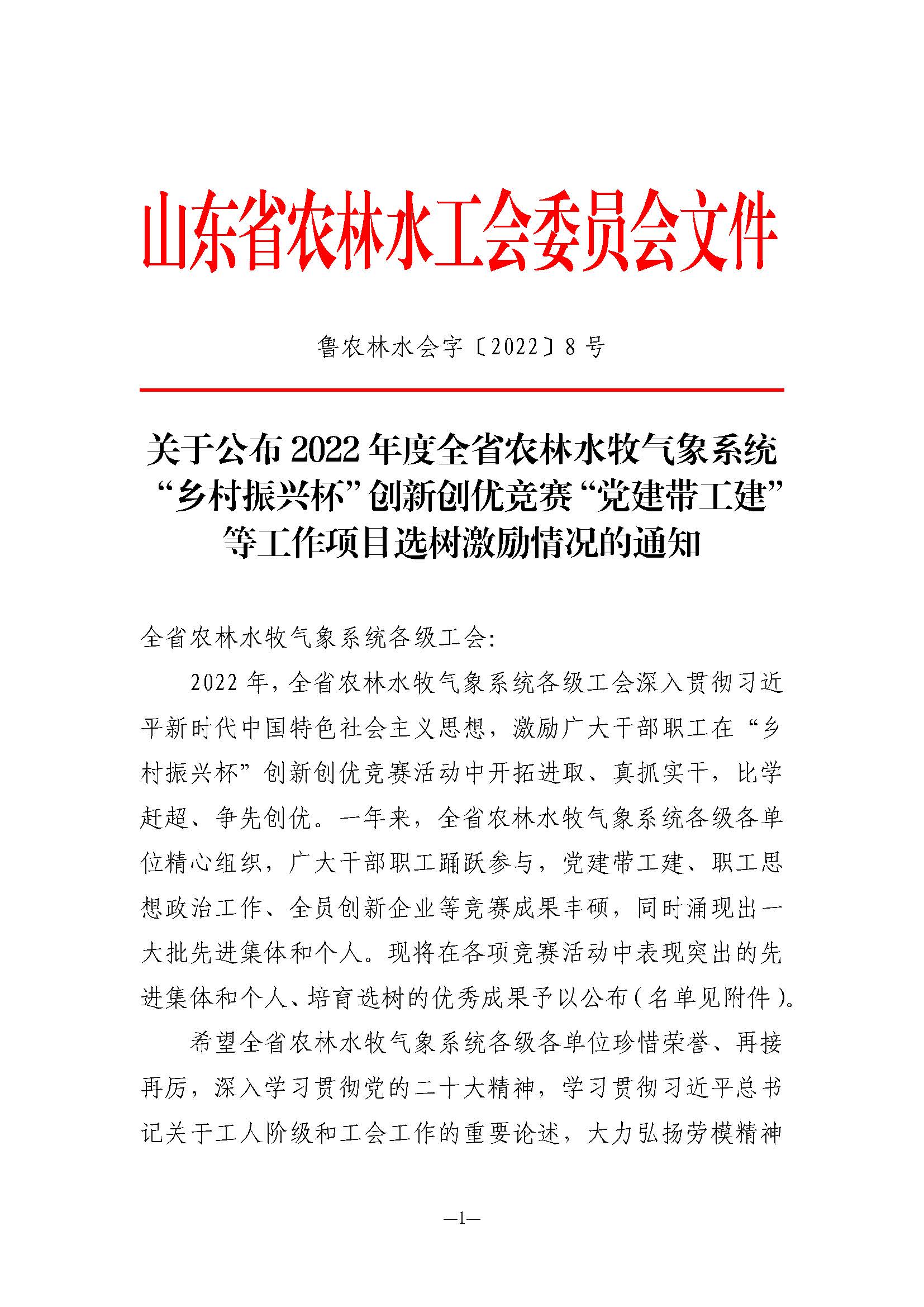 近日,山东省农林水工会委员会下发《关于公布2022年度全省农林水牧气象系统“乡村振兴杯”创新创优竞赛等工作项目选树激励情况的通知》,对涌现出的先进集体、个人和优秀案例予以通报表扬。第六分8xbet体育报送的《以“党建+”系列活动为抓手 实施“党建带工建项目化”管理》和基础8xbet体育报送的《党建带工建 携手共建》两个案例荣获“党建带工建、工建促党建”优秀案例;第二分8xbet体育报送的《坚持以人为本 结合实际开展职工思想政治工作》荣获“职工思想政治工作”优秀案例;刘永恩同志荣获第二届“身边的爱岗敬业榜样”;苏强、谢金虎、李云贺同志荣获“职工安全隐患排查竞赛优秀个人”。