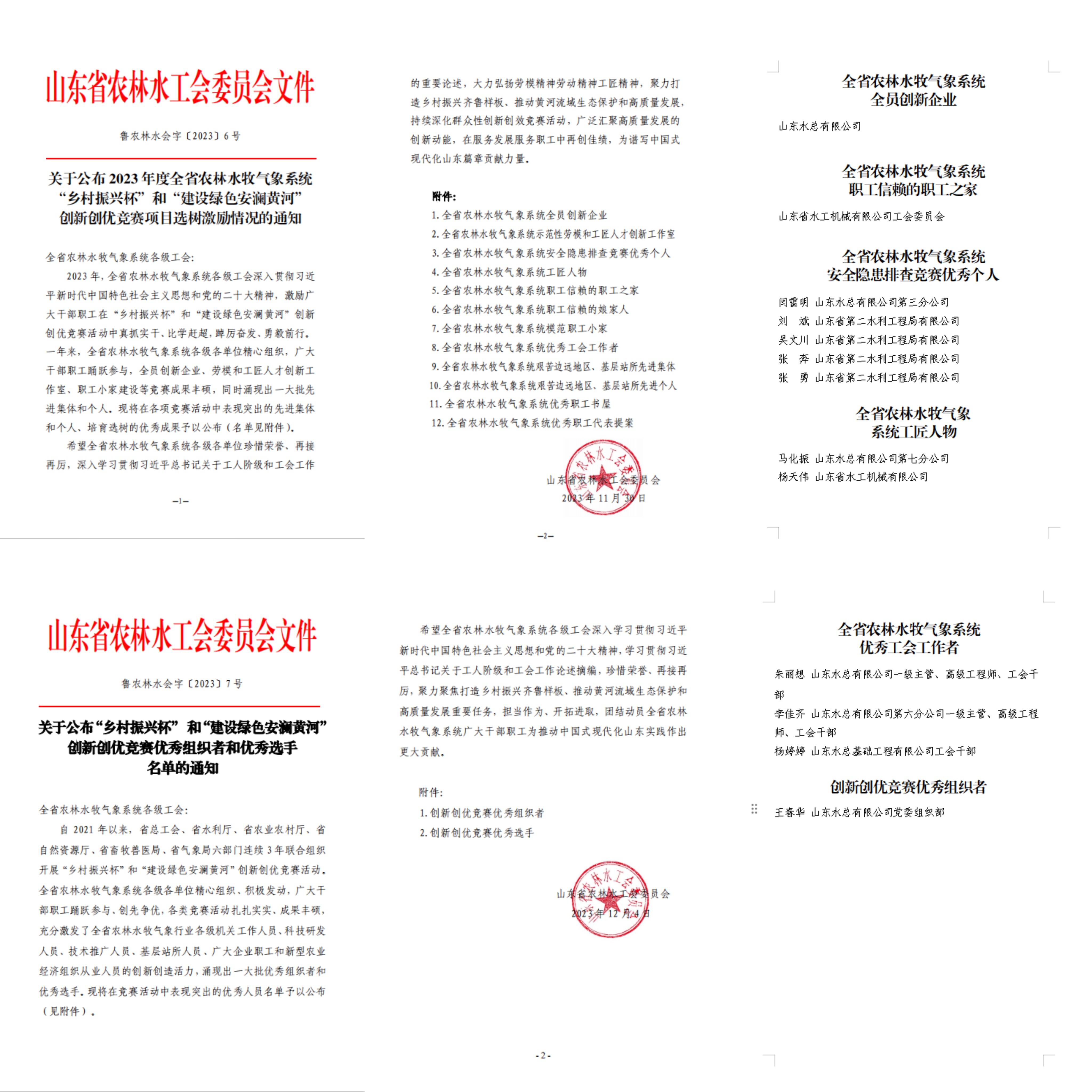 近日,山东省农林水工会下发了《关于公布 2023 年度全省农林水牧气象系统“乡村振兴杯”和“建设绿色安澜黄河”创新创优竞赛项目选树激励情况的通知》《“乡村振兴杯” 和“建设绿色安澜黄河”创新创优竞赛优秀组织者和优秀选手名单的通知》,山东水总荣获全省农林水牧气象系统全员创新企业,水工机械8xbet体育工会荣获“职工信赖的职工之家”,11人分别荣获“职工安全隐患排查竞赛优秀个人”“工匠人物”“优秀工会工作者”“创新创优竞赛优秀组织者”等称号。